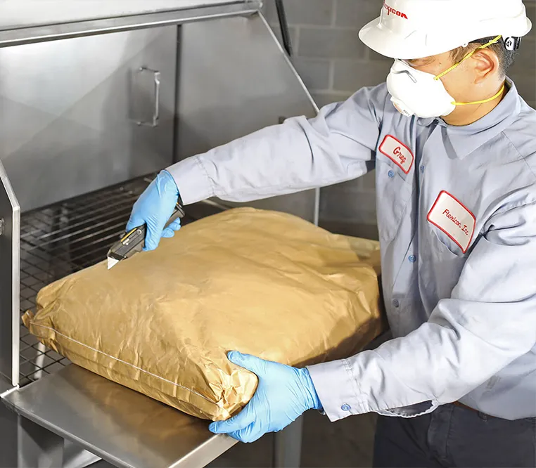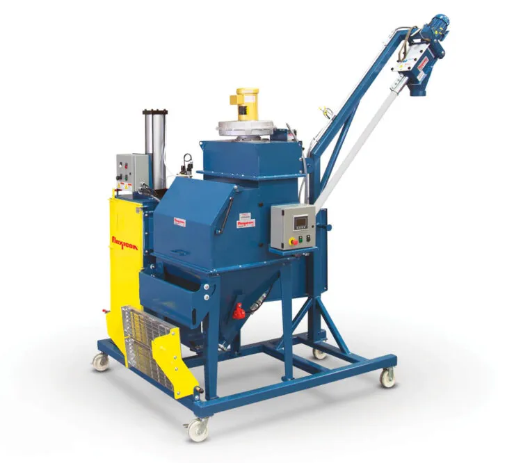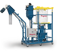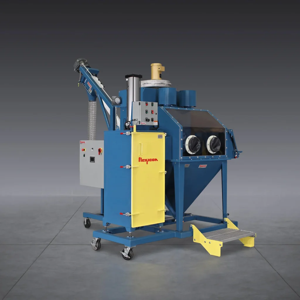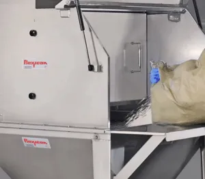 Flexicon Bag Dump Stations can be equipped with optional Bag Compactors, which significantly reduce waste volume while containing dust. A bag infeed chute through the side wall of the dust hood allows empty bags to be fed directly into the bag compactor by the operator causing dust generated from both dumping and bag disposal to be drawn onto the Bag Dump Station’s dual cartridge filters. A pneumatic air cylinder compresses bags into a removable bin for dust-free disposal. Safety interlocks prevent operation unless both the main and infeed chute doors are closed. The Bag Compactors are offered in sizes that accommodate 50 to 80 bags, and 100 to 150 bags, depending on thickness.