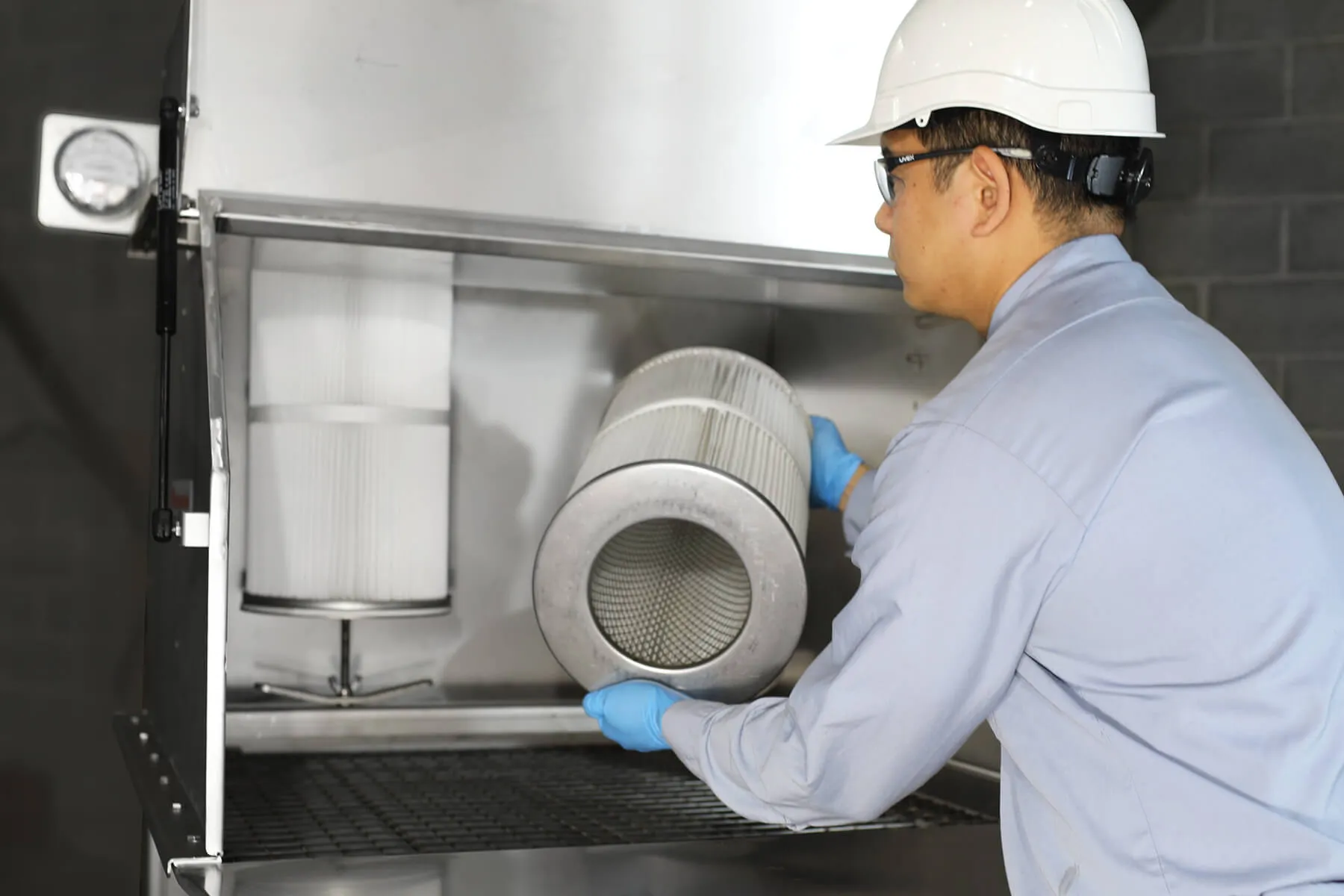 Vacuum fan draws airborne particles away from the operator and into cartridge filters.